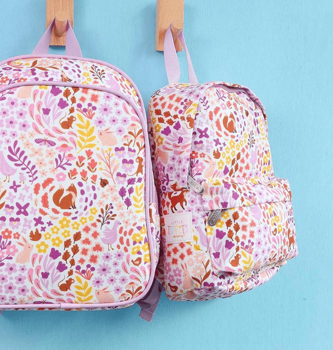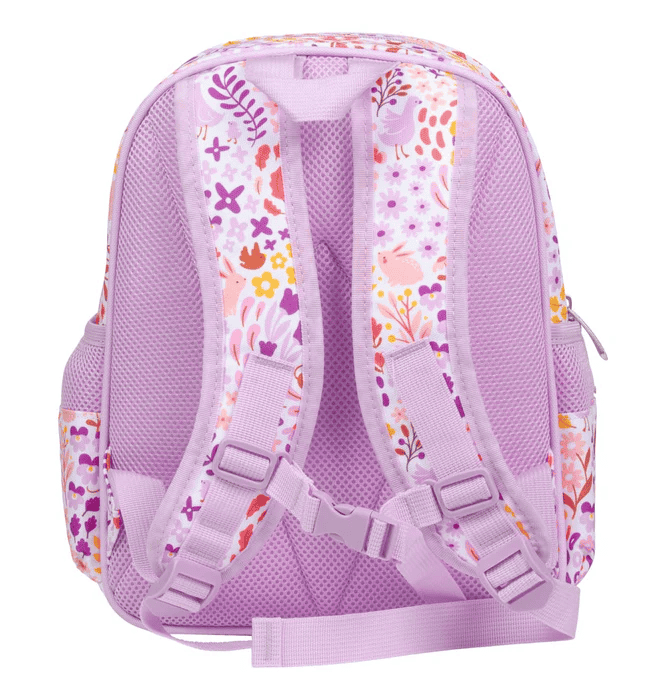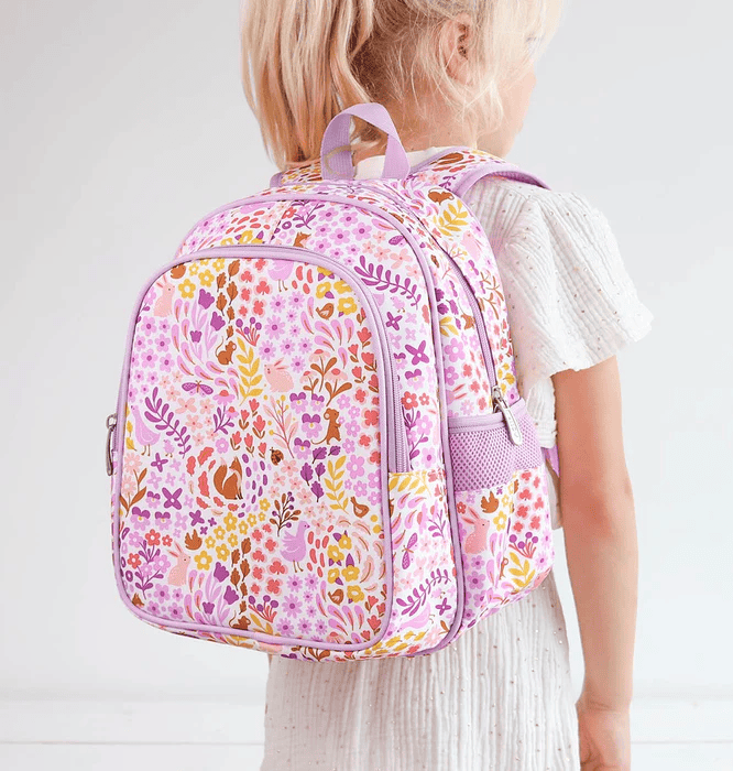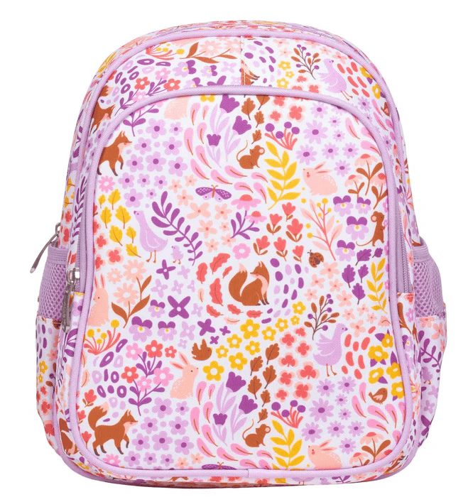 Flower garden backpack is a toddler‑sized backpack in light lavender fabric, printed all over with a whimsical “flower garden” pattern: pink, purple, yellow and orange flowers interspersed with tiny foxes, birds, and leaves.