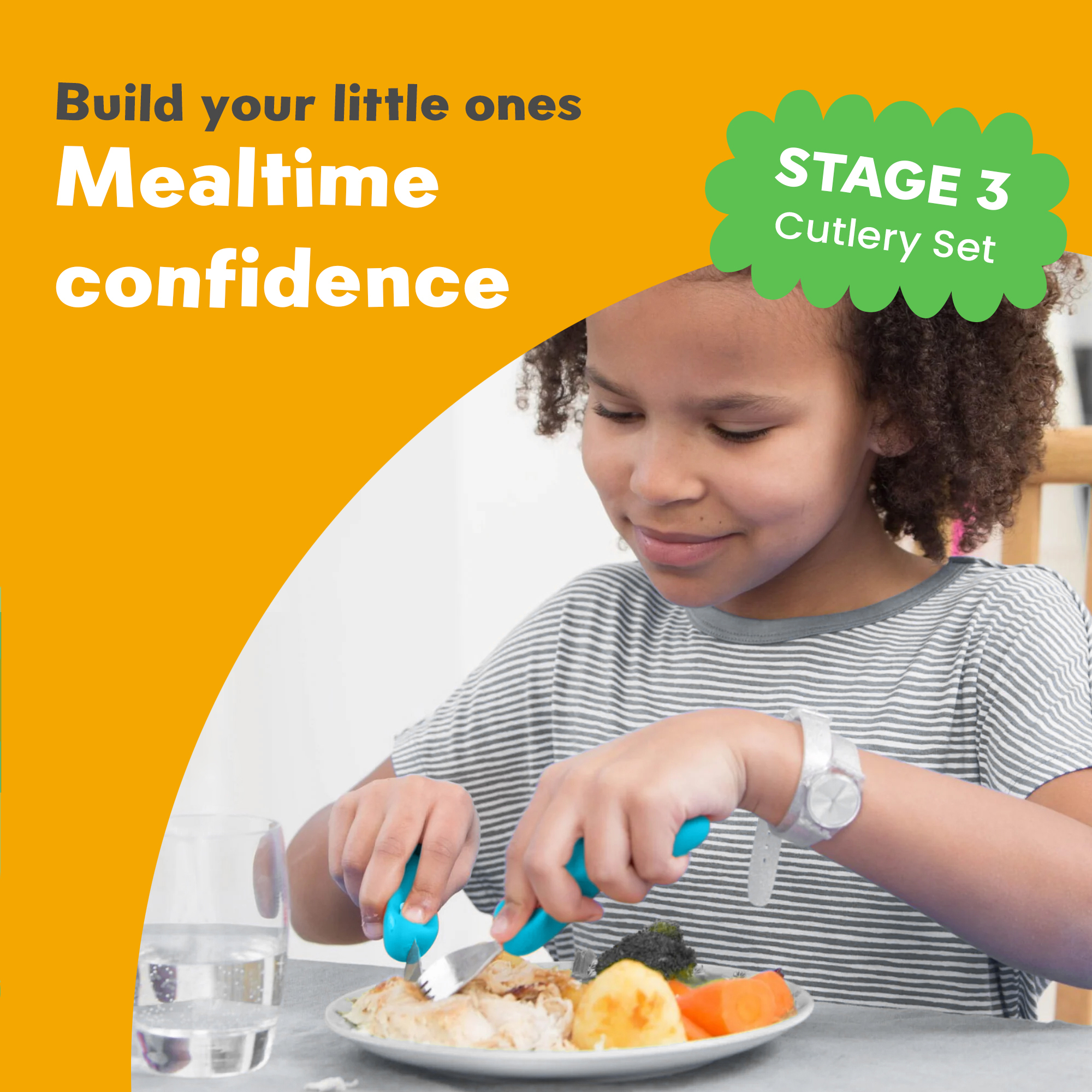 The Stage 3 childrens cutlery sets are designed for reception and primary school aged children aged from 3 – 9 years old. Ideally suited for children comfortably using their left and right handed movement together when eating and becoming more independent at mealtimes and doing what the big kids do!