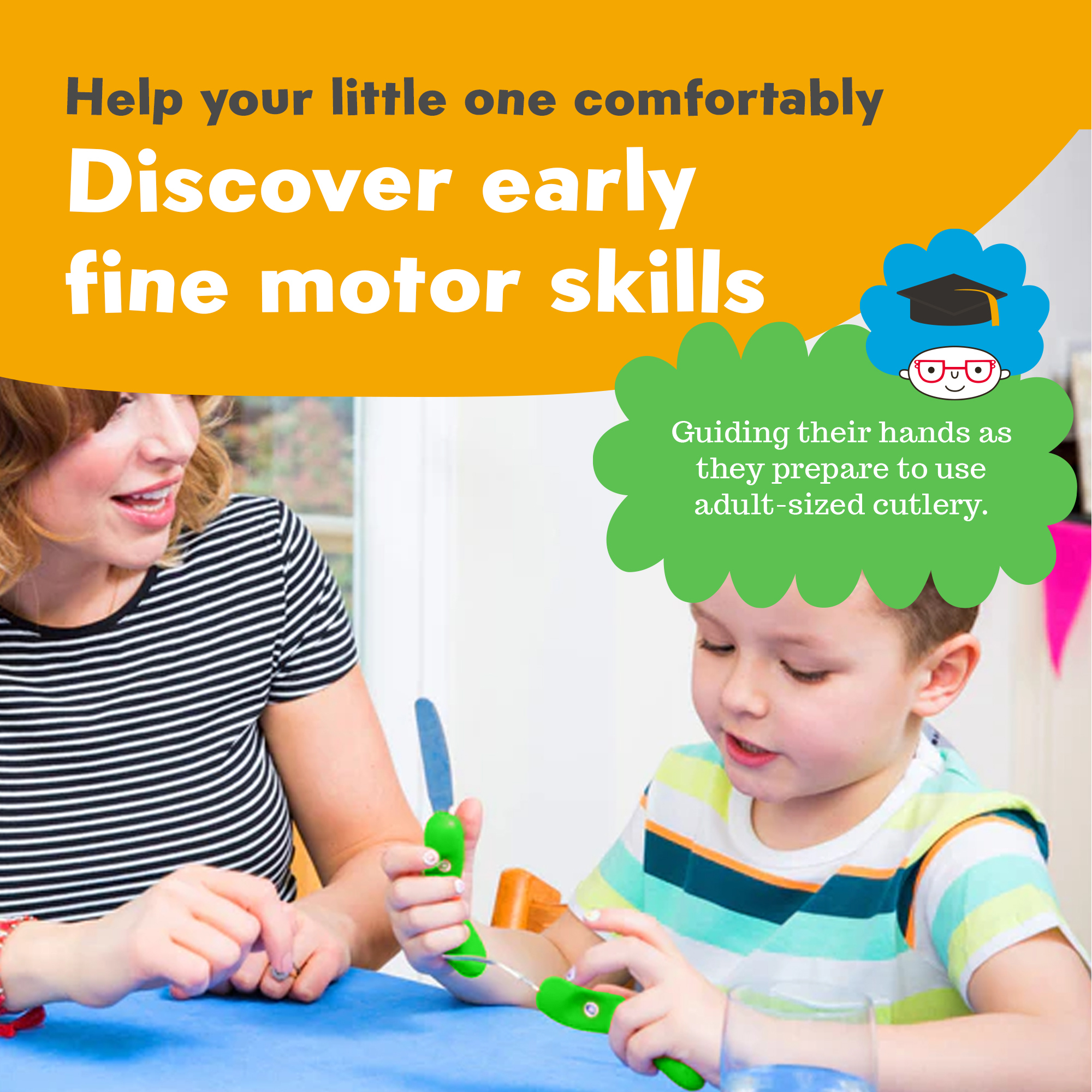 Nana’s Manners children’s cutlery can also be used in play, e.g., with play-dough! This is done in many nurseries and school settings. That’s a lot of fine motor skill development support rolled into the everyday task of eating!