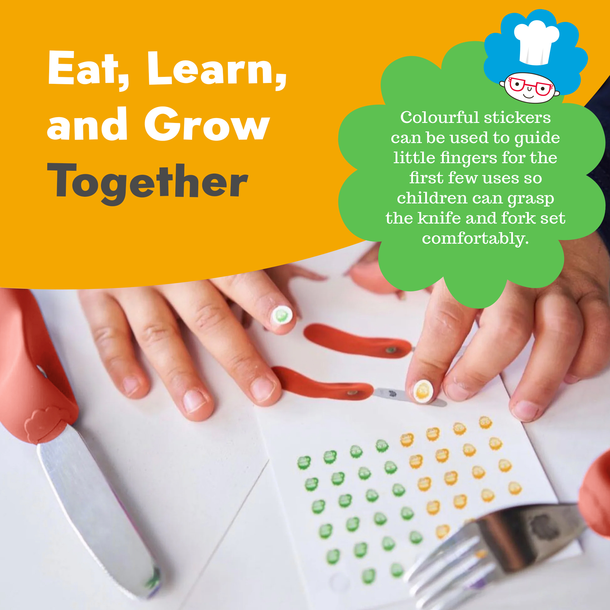 The children cutlery set designed to promote independence at mealtimes whilst making learning to use a knife & fork fun and easy for little hands. These are the last sets your children will need until they are ready for adult sized cutlery.