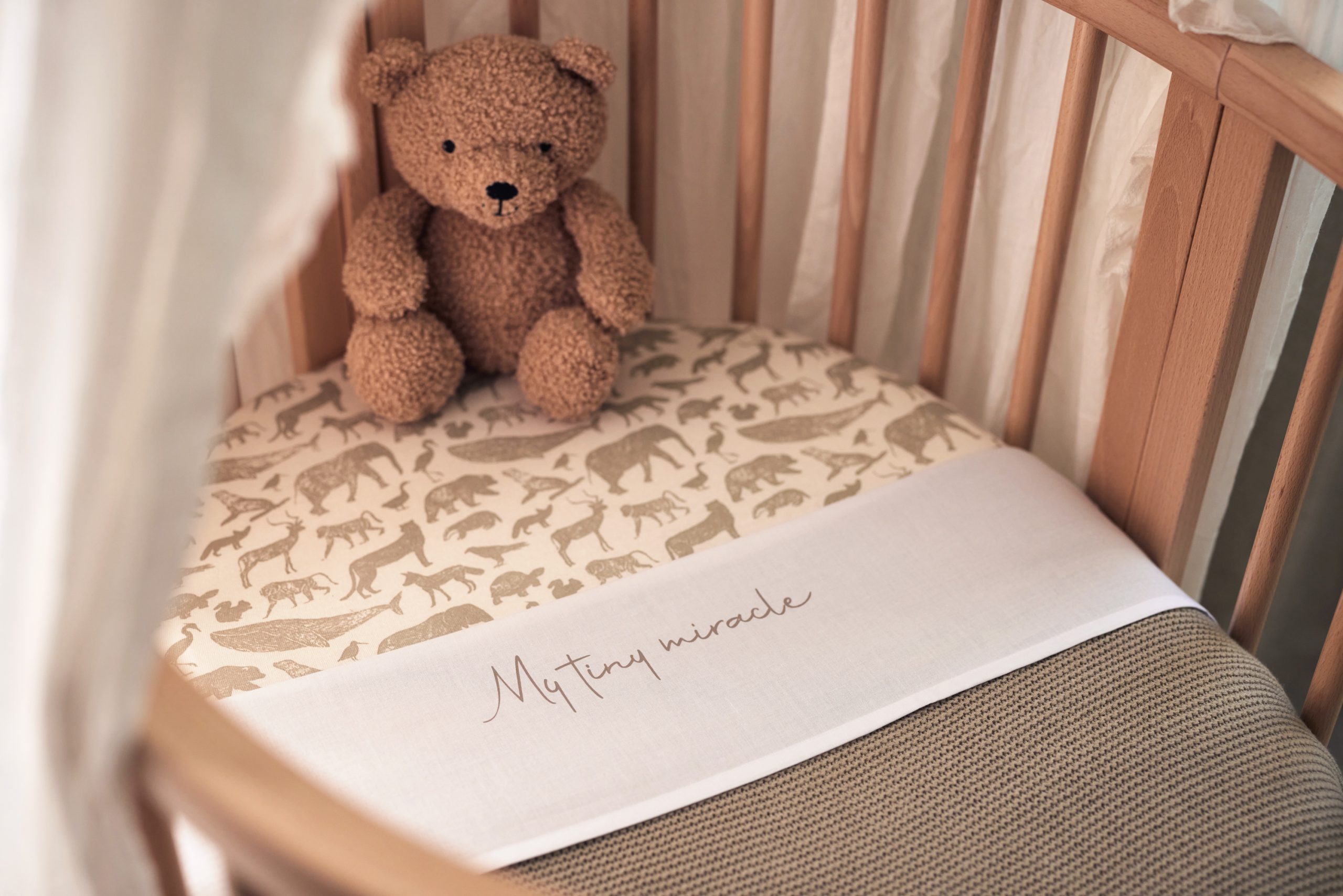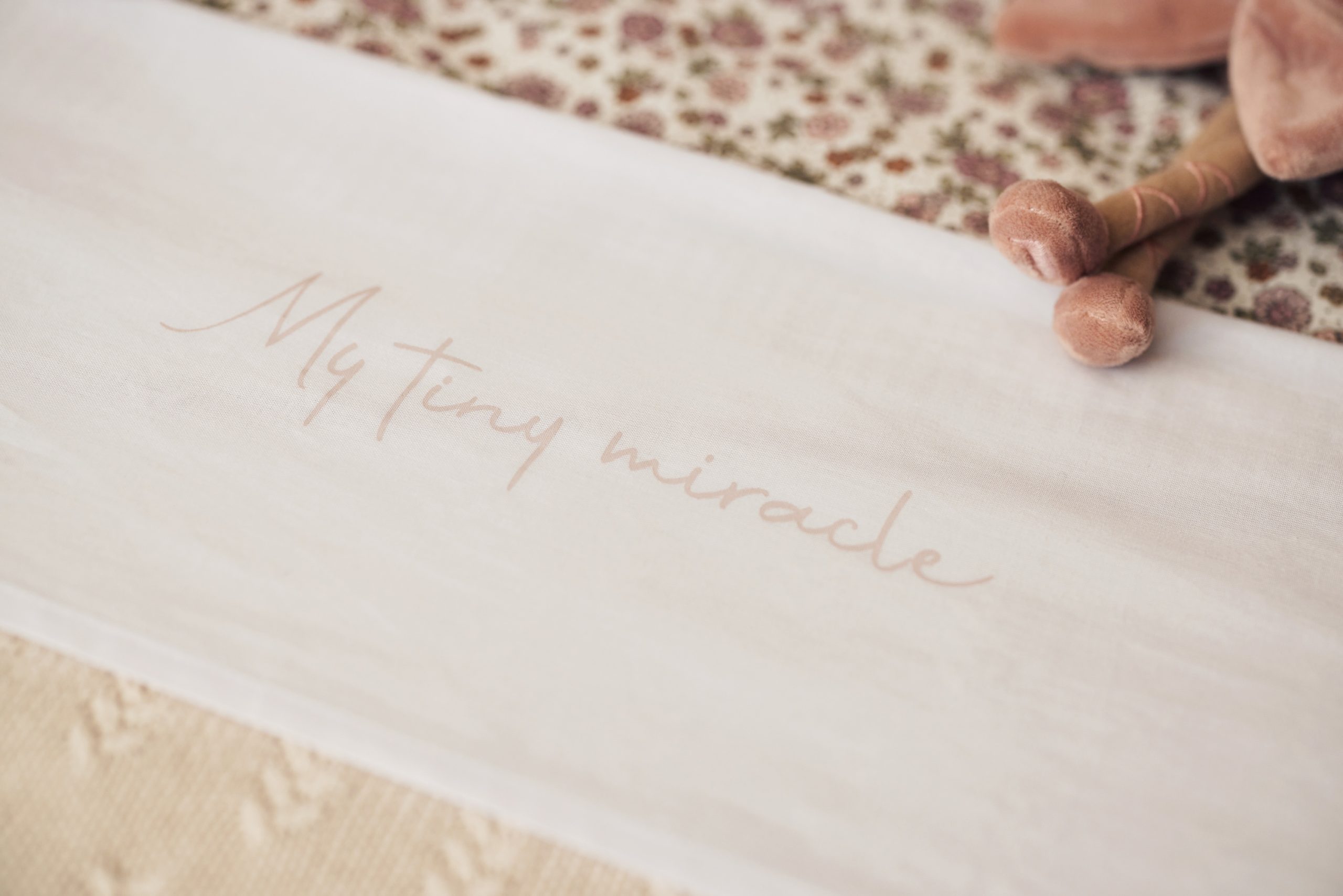 Embrace the charm and warmth of this upper sheet, adorned with the heartwarming phrase “My Tiny Miracle” along its border. This delicate message wraps the sheet in a loving touch, celebrating the preciousness of your little one. The gentle design adds a tender, personal element to any nursery, making it a perfect choice for creating a nurturing and sentimental space for your baby.