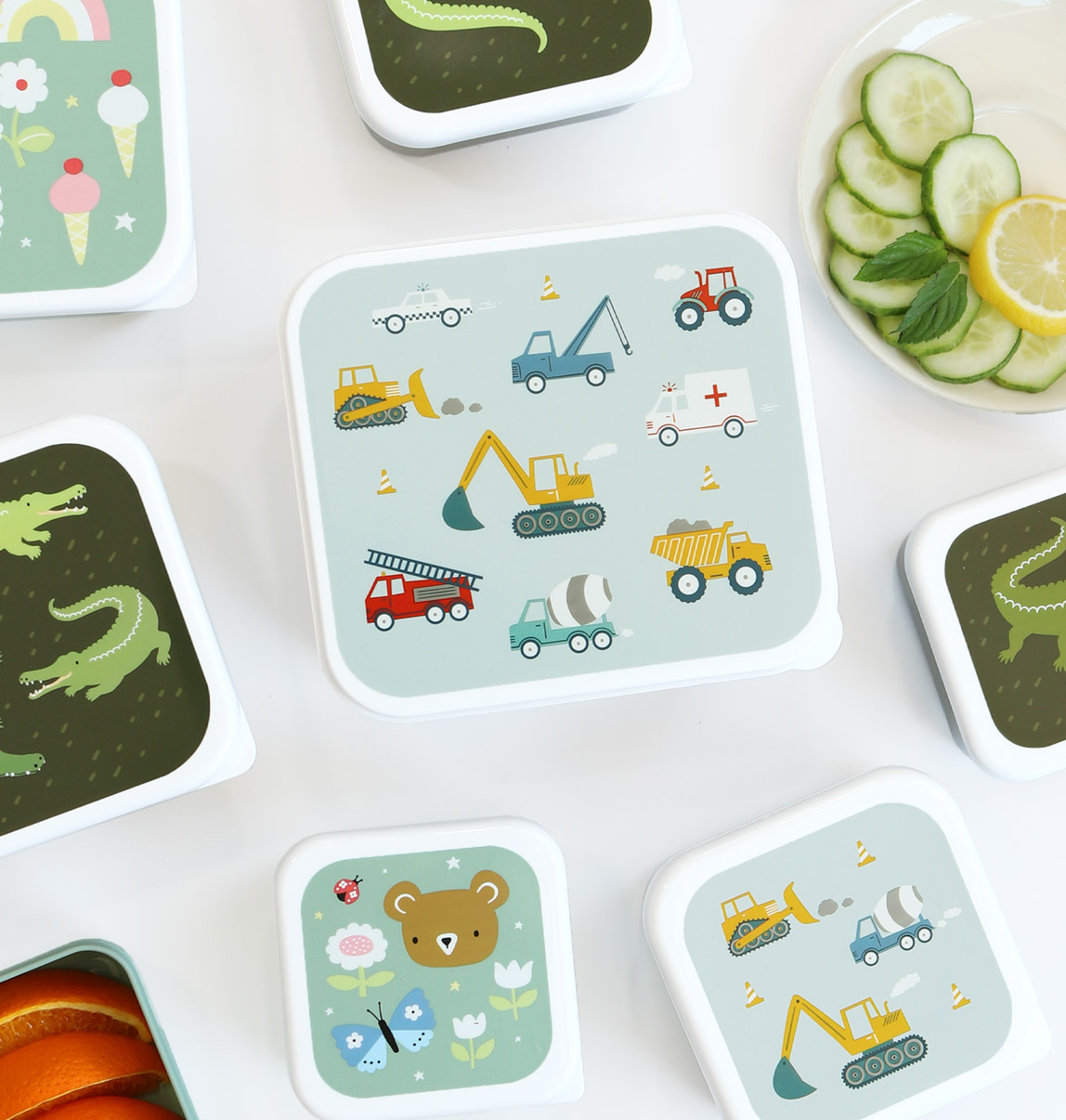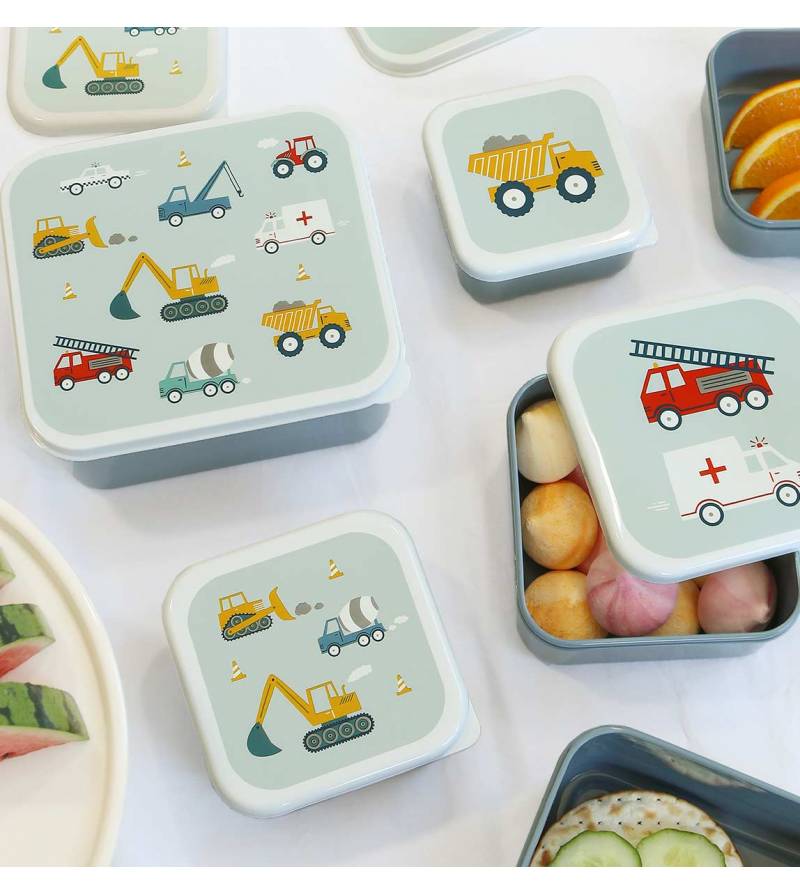 Set of four lunch and snack boxes in four different sizes and matching designs. They come in cheerful and colourful themes, making lunchtime even more enjoyable.