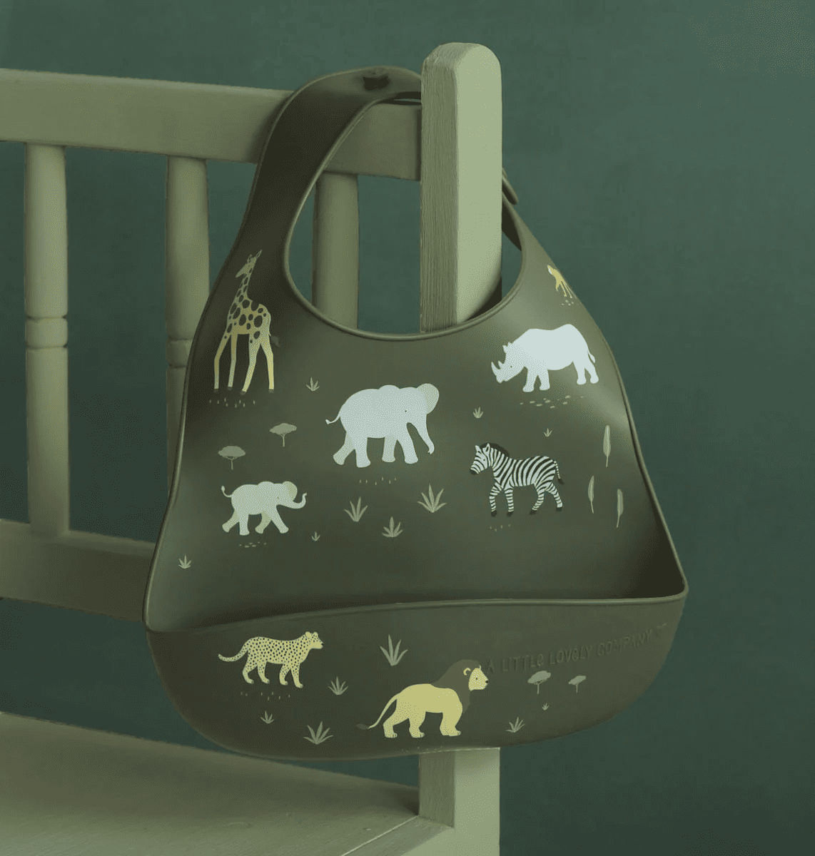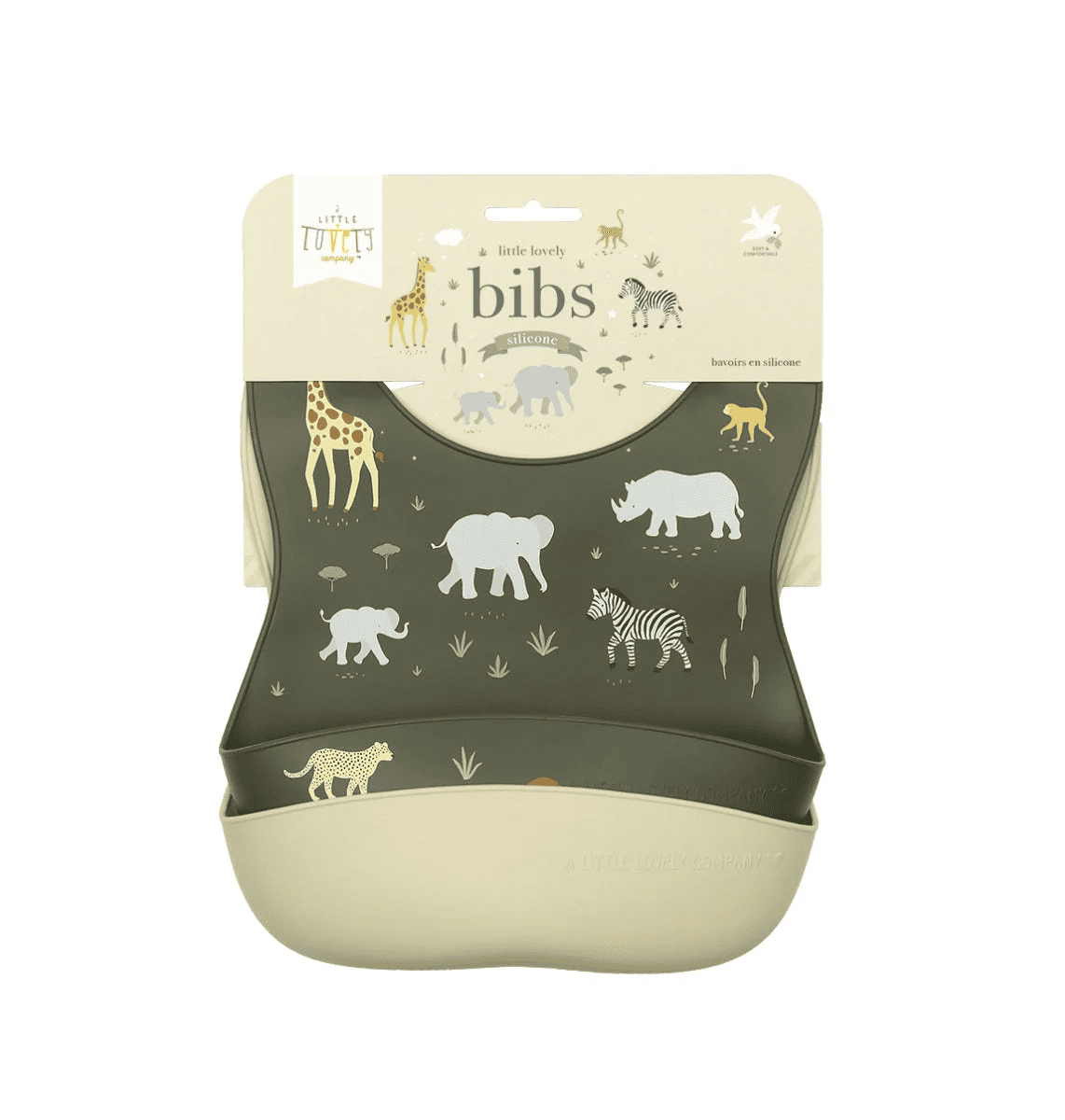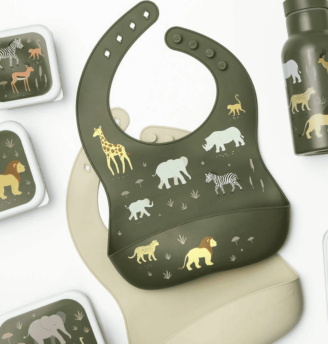 A set of two gray silicone bibs, including one with a charming savanna design and another in a coordinating solid color. These waterproof bibs are easy to clean and feature a catch-all front pocket. They are adjustable in size and can be conveniently rolled up for compact storage.