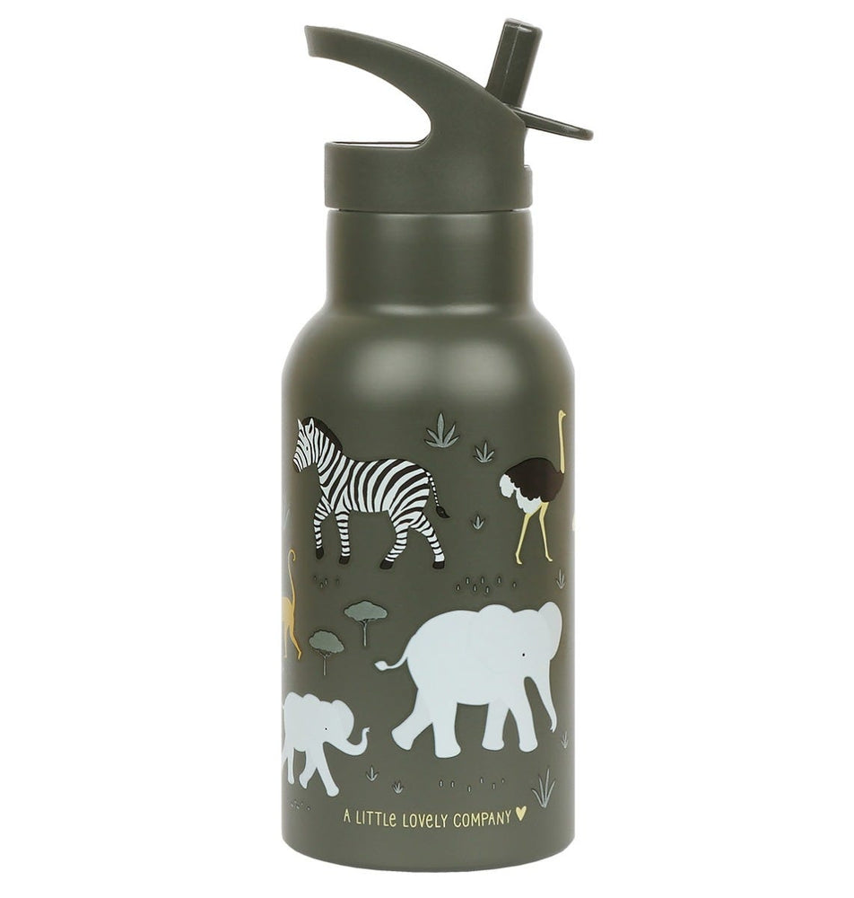 This double-walled, thermos bottle is crafted from stainless steel and features a fun Savanna design. The 350 ml bottle includes a twist cap, drinking spout, and straw, making it perfect for cold beverages.