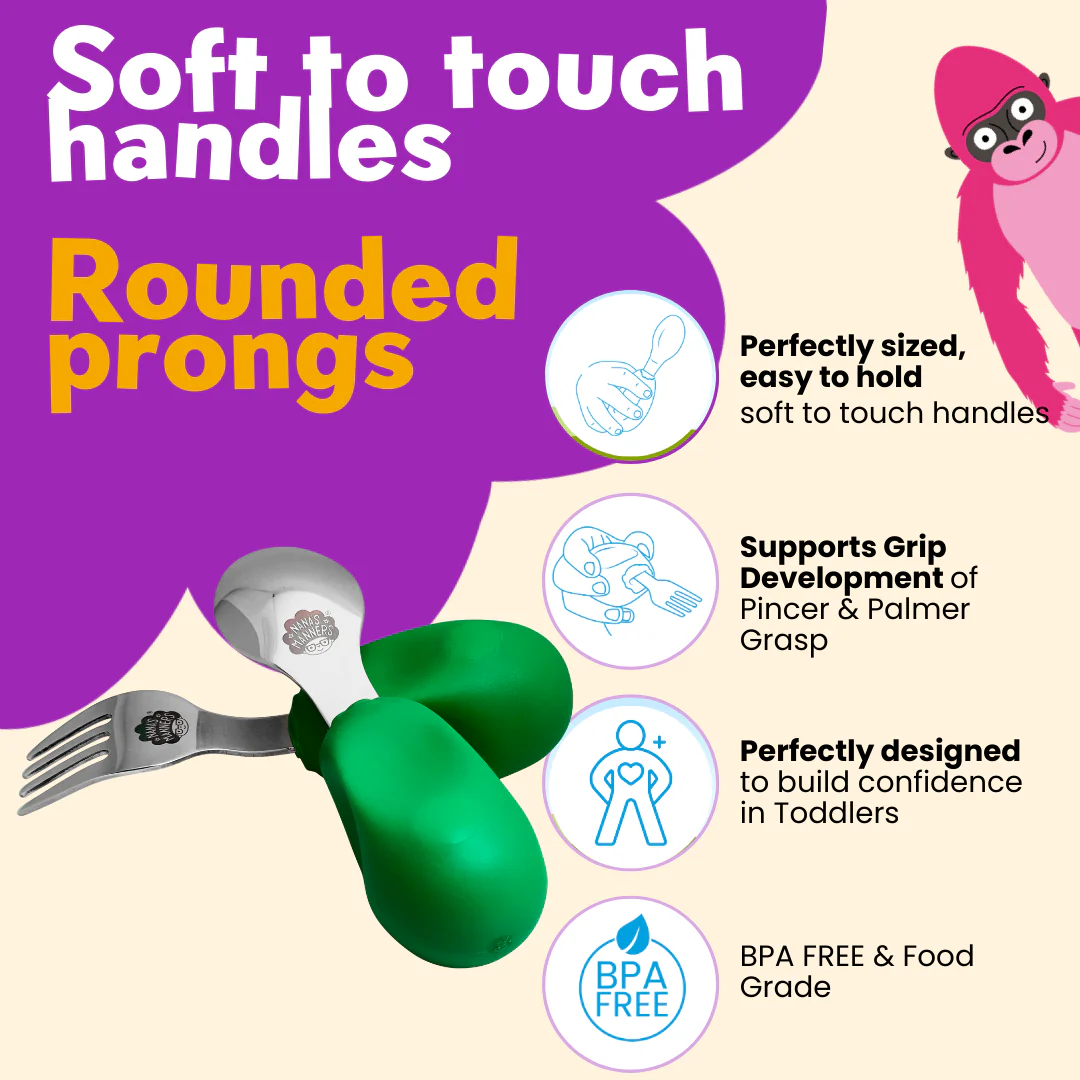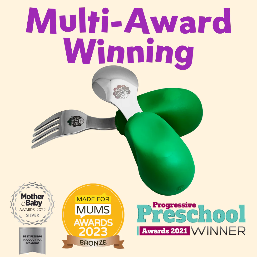 Nana’s manners toddler cutlery set’s ergonomic design encourages your child’s progression in grip development, helping to strengthen hands muscles and promote the natural movement of left and right-handed co-ordination in preparation for the next stage.