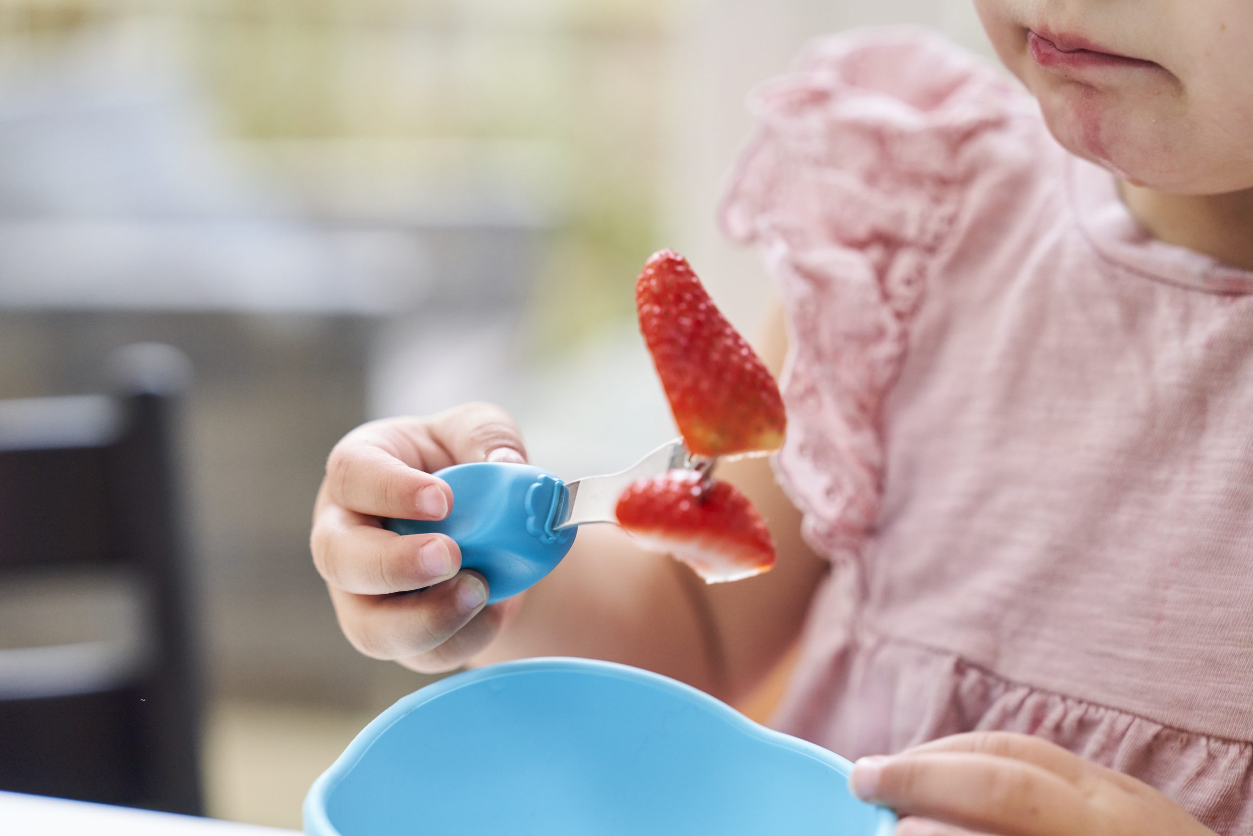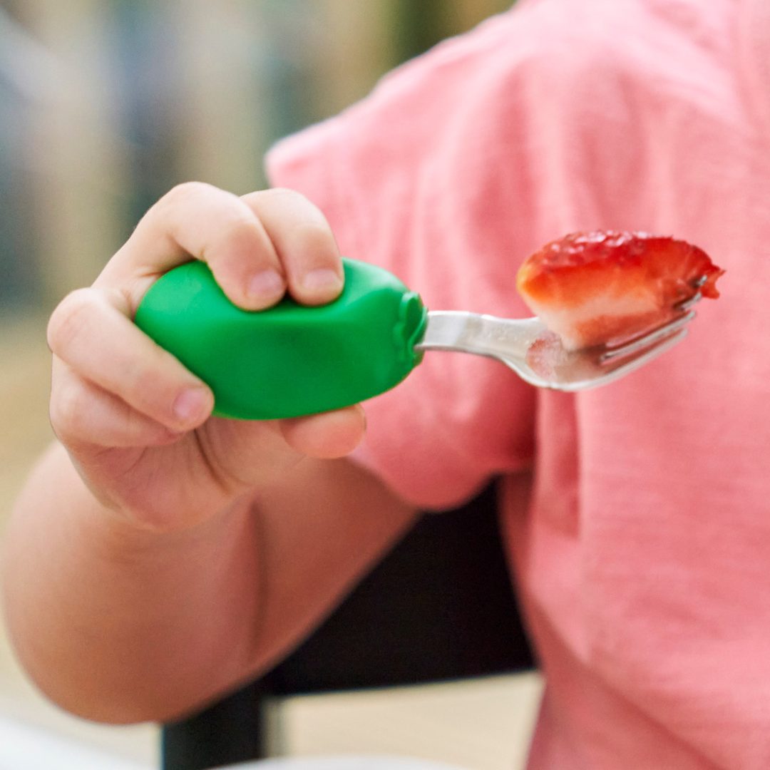The stainless steel fork and spoon sets are shaped for babies and toddlers to use independently from around 12 months old. They are designed and shaped especially to support children’s grip development whilst building confidence at mealtimes. Using the Palmar grasp can work well for larger objects, but babies won’t be able to grab smaller objects, like peas and raisins, until they develop the finger dexterity needed for the pincer grasp. This happens when they’re around 9-10 months old. The pincer grasp uses the forefinger and thumb together to “pinch’ or grasp a smaller object.