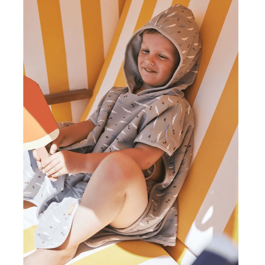 Made from durable, ultra-absorbent Terry fabric with UPF50+ protection, it also includes a hood for quick hair drying.